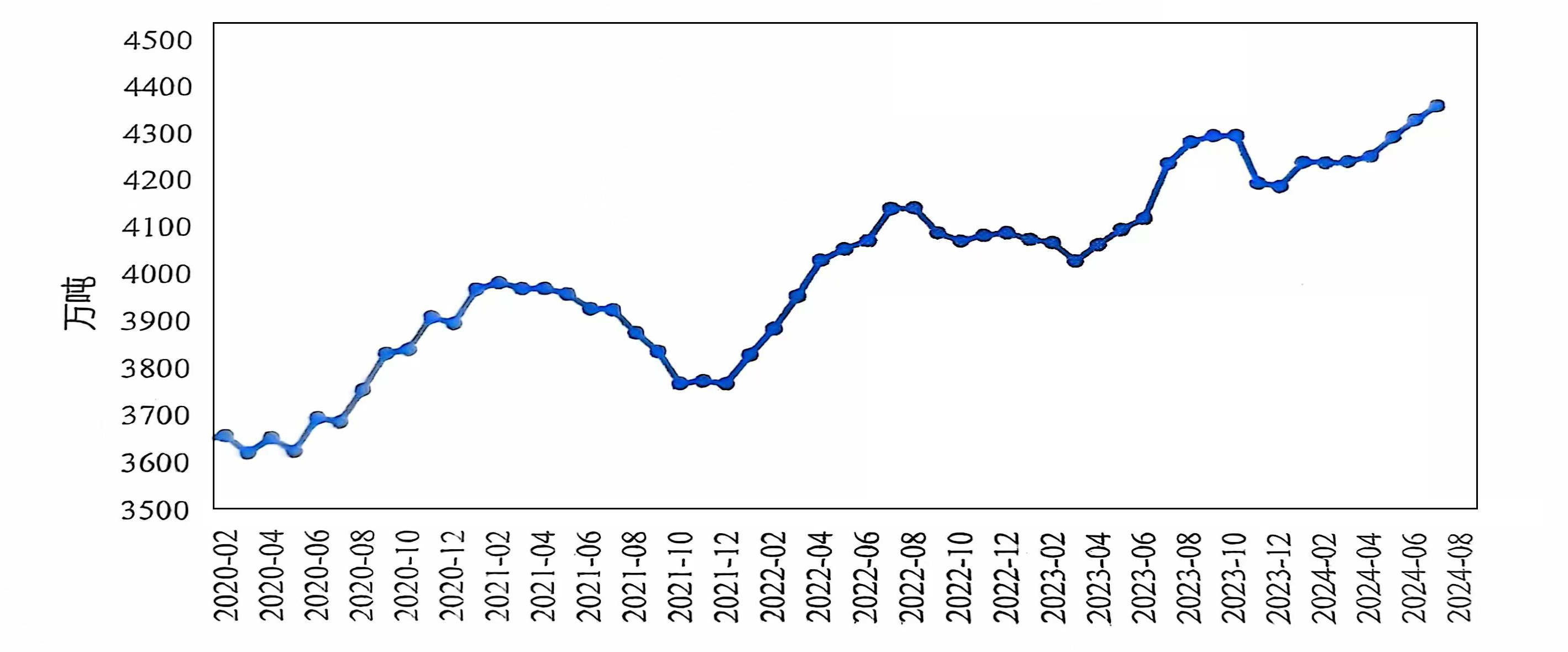 2024年以來,隨著云南地區(qū)電解鋁企業(yè)的全面復(fù)產(chǎn)以及內(nèi)蒙古地區(qū)新產(chǎn)能的投放,國內(nèi)電解鋁運行產(chǎn)能在上半年持續(xù)增加,并在8月繼續(xù)保持穩(wěn)定。20248月,國內(nèi)電解鋁建成產(chǎn)能4462萬噸/年,運行產(chǎn)能4346萬噸/年,較上月持平。8月份產(chǎn)量為371.5萬噸,環(huán)比增長0.1%,同比增長2.0%,日均產(chǎn)量11.98萬噸,環(huán)比下降3.1%