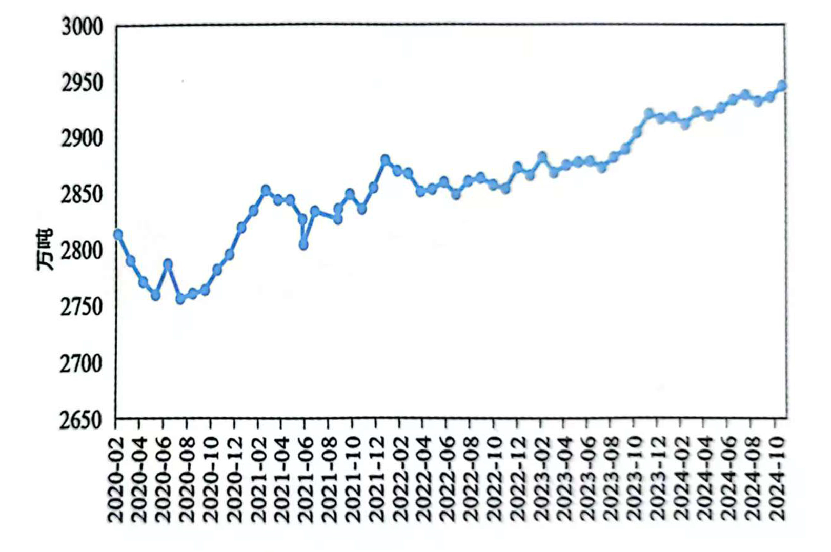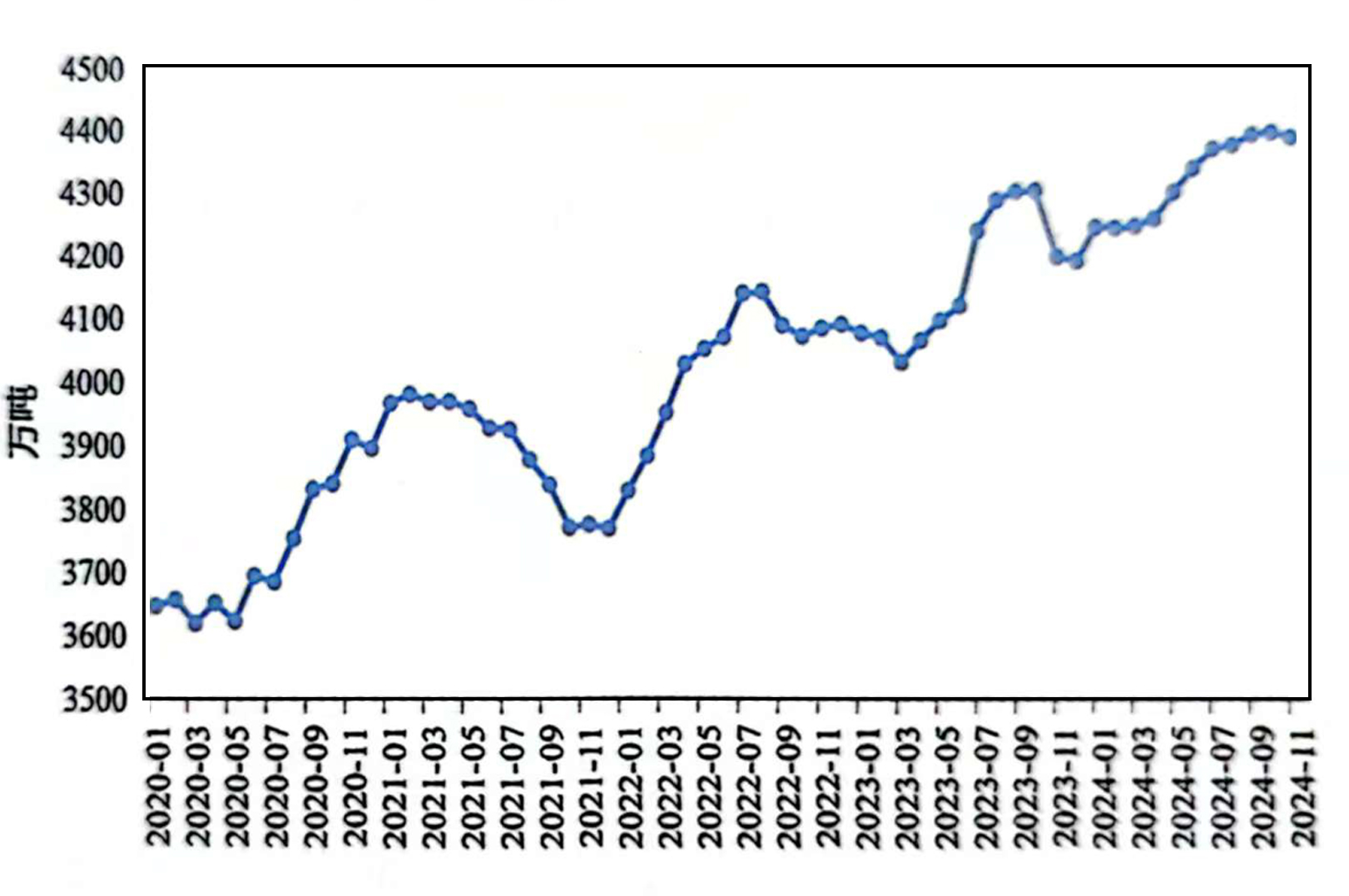 2024年11月,中國電解鋁企業(yè)增減產(chǎn)并存。減產(chǎn)方面,河南、廣西、貴州、四川等地區(qū)的部分鋁廠由于環(huán)保、生產(chǎn)經(jīng)營壓力大等因素而宣布檢修、停槽或放緩復(fù)產(chǎn)計劃:新投方面,11月初貴州地區(qū)雙元鋁業(yè)二期項目鋁水下線,預(yù)計12月底全部投產(chǎn),新疆信發(fā)、寧夏寧創(chuàng)也在持續(xù)投產(chǎn)中。11月國內(nèi)電解鋁建成產(chǎn)能4462萬噸/年,運(yùn)行產(chǎn)能4374萬噸/年,較上月增長11萬噸/年。11月份產(chǎn)量為360.6萬噸,環(huán)比下降3.4%,同比增長4.5%,日均產(chǎn)量12.02萬噸,環(huán)比小幅下降0.2%。