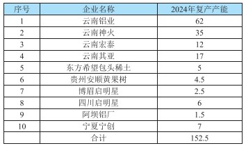 2-2 2024年中國(guó)電解鋁復(fù)產(chǎn)產(chǎn)能變動(dòng)情況(萬(wàn)噸/)