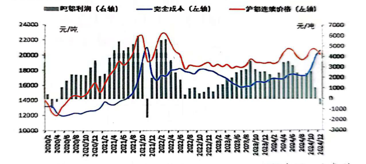 2024年,盡管氧化鋁價(jià)格大幅波動(dòng)導(dǎo)致電解鋁成本重心明顯抬升,但從全年來(lái)看,鋁價(jià)持續(xù)高位運(yùn)行,電解鋁行業(yè)依舊維持2000/噸以上的利潤(rùn),尤其是在5月份,利潤(rùn)達(dá)到3581/噸的年內(nèi)最高水平。根據(jù)安泰科測(cè)算,2024年中國(guó)電解鋁加權(quán)平均完全成本(含稅)17717/噸,同比增加7.4%1223/噸;全年噸鋁平均利潤(rùn)約為2227元,同比增加0.9%20元。