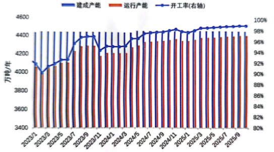 2025年10月,國內(nèi)電解鋁生產(chǎn)能力保持高位持穩(wěn)。截至10月底建成產(chǎn)能4470萬噸/年,運行產(chǎn)能4420萬噸/年,與上月基本持平。未來兩個月,隨著扎鋁二期35萬噸/年建成,預(yù)計2025年底建成產(chǎn)能將達(dá)到4505萬噸/年。在產(chǎn)能幾近“天花板”,開工率始終維持98%以上背景下,無論是產(chǎn)能還是產(chǎn)量的增長空間都極為有限。