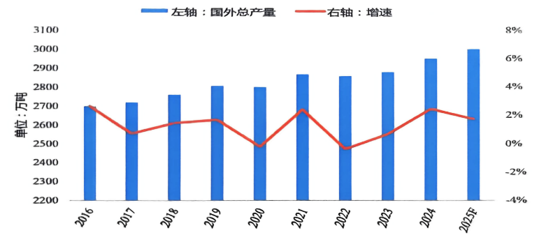 安泰科統(tǒng)計,截至2025年底,全球電解鋁總生產(chǎn)能力7889萬噸/年,其中國外產(chǎn)能合計3473萬噸/年,與上年增長0.5%;2025年全球電解鋁產(chǎn)量約為7423萬噸,較上年增加1.7%;其中,國外電解鋁產(chǎn)量為3000萬噸,同比上漲1.7%,占全球總產(chǎn)量的40.4%