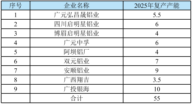 1-2  2025年中國電解鋁復(fù)產(chǎn)產(chǎn)能變動情況(萬噸/)