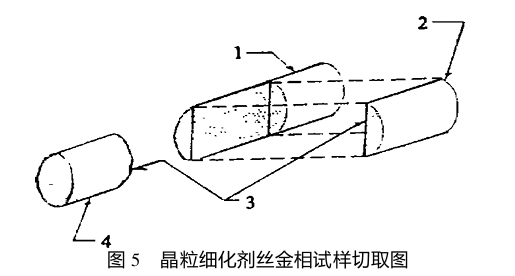 絲:從一卷任意部取一段要求重量的晶粒細(xì)化劑;金相檢驗試樣的縱、橫截面如圖5所示;機(jī)械性能測量試樣長度應(yīng)保證300mm。